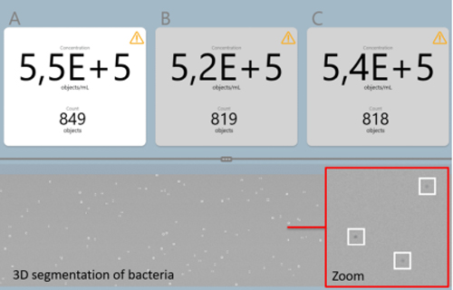 對于細(xì)菌計(jì)數(shù),我們使用體積成像法來計(jì)數(shù)整個(gè)體積中存在的細(xì)菌。細(xì)菌沉降非常緩慢,并且存在于整個(gè)成像體積中。因此我們可以捕獲所有細(xì)菌,可測量細(xì)菌小至0.5 μm像素。