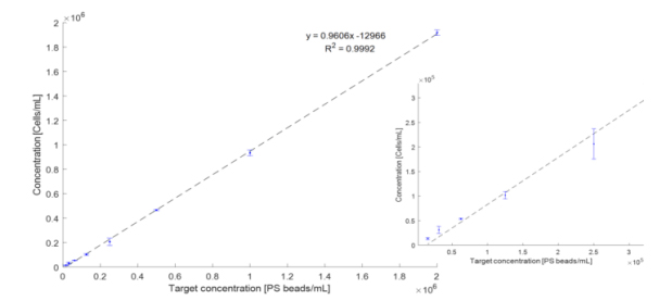 圖1 用μCount3D立體計(jì)數(shù)儀測量2倍稀釋的1 μm質(zhì)控微珠的線性響應(yīng),R2=0.9992。線性響應(yīng)是評估計(jì)數(shù)系統(tǒng)性能的關(guān)鍵參數(shù),它指的是計(jì)數(shù)系統(tǒng)在特定濃度范圍內(nèi)產(chǎn)生與實(shí)際數(shù)量成正比的結(jié)果的能力。