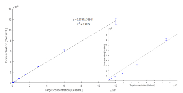 圖3, TSB中過夜2倍稀釋的大腸桿菌培養(yǎng)物。藍(lán)線表示使用μCount3D立體計(jì)數(shù)儀的自動(dòng)計(jì)數(shù)。橙色線表示使用瓊脂平板測定法在TSA上的菌落計(jì)數(shù)。圖3線性響應(yīng)為R2=0.987。
