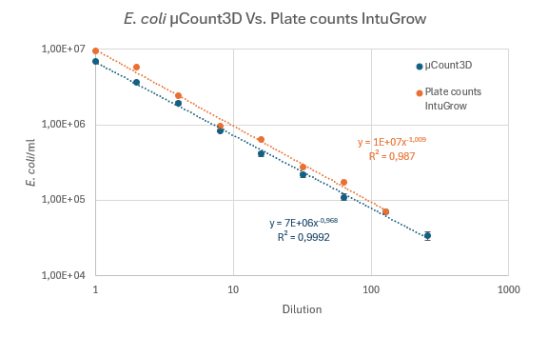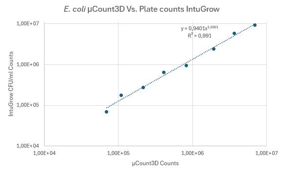 我們建立了一個(gè)驗(yàn)證測試,使用μCount3D立體計(jì)數(shù)儀和瓊脂菌落培養(yǎng)計(jì)數(shù)來測量大腸桿菌。為了精確菌落計(jì)數(shù),我們使用IntuGrow快速CFU/mL測定法(IntuBio,F(xiàn)arum,Denmark,www.IntuBio.dk)。