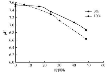 生長(zhǎng)曲線兩種接種濃度豬鼻支原體生長(zhǎng)曲線見圖1和圖2。從圖1可以看出,以3%濃度接種,豬鼻支原體在0~48 h活菌濃度平穩(wěn)上升,生長(zhǎng)速率逐漸升高。以10%濃度接種,豬鼻支原體在0~48 h活菌濃度持續(xù)上升,0~6 h為遲緩期,6~48 h為對(duì)數(shù)期,其中24~30 h生長(zhǎng)速率最快。從圖2可以看出,0~48 h內(nèi),兩種濃度接種菌液pH值變化范圍和趨勢(shì)大致相同,變化范圍為6.63~7.55。3%濃度接種,0~16 h內(nèi),pH值下降平緩,16~48 h pH值下降速度較快。10%濃度接種,0~6 h內(nèi),pH值下降平緩,6~48 h pH值下降速度較快,且10%比3%pH值下降更快。