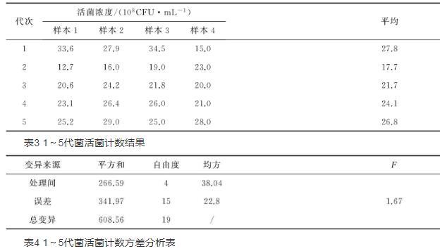 1~5代菌活菌計(jì)數(shù)結(jié)果活菌計(jì)數(shù)結(jié)果見表3。各代次間活菌濃度進(jìn)行差異分析結(jié)果見表4,F(xiàn)=1.67