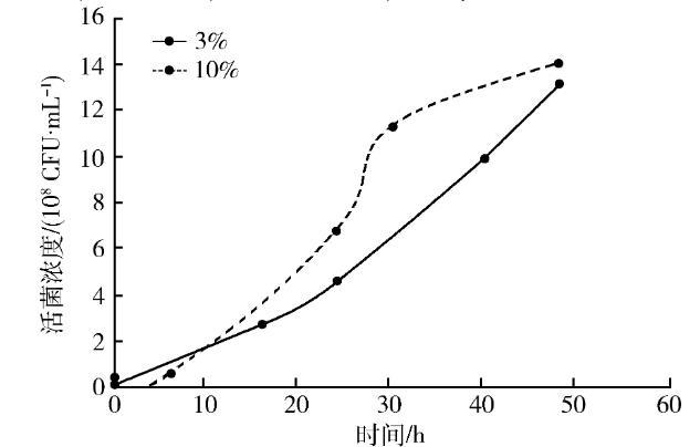 不同接種濃度活菌濃度和pH值的比較兩種濃度接種的豬鼻支原體各時(shí)間點(diǎn)的活菌濃度和pH值如表1和表2所示。從表1可以看出,3%濃度接種的豬鼻支原體0~48 h活菌濃度持續(xù)上升,到48 h達(dá)到峰值13.1×108CFU/mL,菌液pH值則持續(xù)下降,在40~48 h之間某時(shí)刻降至7.0以下。從表2可以看出,10%濃度接種的豬鼻支原體0~48 h活菌濃度持續(xù)上升,到48 h達(dá)到峰值14.0×108CFU/mL,菌液pH值則持續(xù)下降,在30~48 h之間某時(shí)刻降至7.0以下。