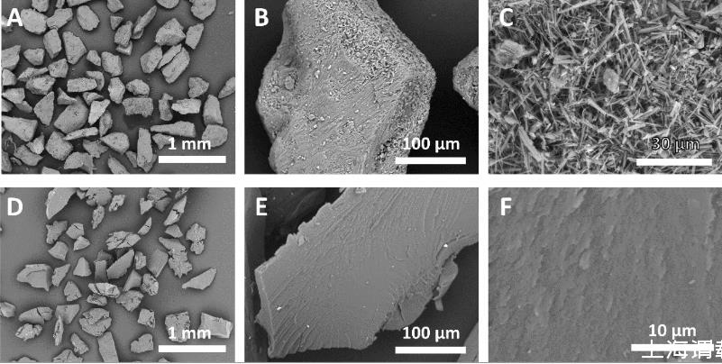 圖2、兩種測試配方經(jīng)過粒度分級(180–355μm)后的掃描電子顯微照片。AC:在50°C下儲存四天后的純重結晶EFV顆粒。HPMCAS AS-LF中DF ASD為20%(w/w)EFV。
