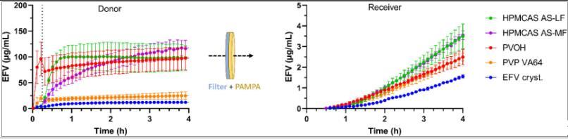 圖3、體外D/P設置的供體和受體室中的EFV濃度分布,包括。親水性PVDF過濾器作為PAMPA膜和供體室之間的物理邊界。將測試制劑(純結晶EFV和4個20%(w/w)EFV的ASD,在9號明膠膠囊中列出的聚合物基質中)在t=0分鐘時添加到供體隔室中。左圖的虛線表示從胃部pH值3.5到腸道pH值7.0的變化。