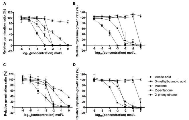 研究的結(jié)果表明D.hansenii的抗真菌活性是復(fù)雜的,并且可能是由幾種抑制性VOC的協(xié)同和/或相加作用產(chǎn)生的,而不是單一化合物的作用。同樣,已證明經(jīng)證實的生物防治酵母W.anomalus BS91和M.pulcherrima MPR3對包裝新鮮水果中的采后病原霉菌的生長抑制是由VOC和CO 2的協(xié)同作用引起的。此外抑制鐮刀菌屬。在植物乳桿菌(以前稱為植物乳桿菌)的無細胞上清液中生長)已被證明不是由乳酸菌產(chǎn)生的乳酸單獨產(chǎn)生的。