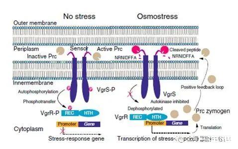 圖5、VgrS蛋白水解引起的細菌應(yīng)激反應(yīng)模型。當(dāng)細菌在滲透脅迫下生長時,Prc被激活并分裂n端肽(NRNIDFFA)對VgrS的感測區(qū)具有抑制作用,導(dǎo)致后者的自身磷酸化。