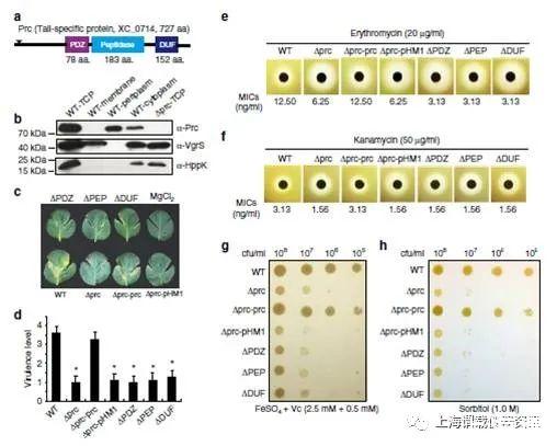 圖1、圖a表示的是Prc蛋白質(zhì)二級結(jié)構(gòu)示意圖。圖b表的是Prc蛋白是位于細菌周質(zhì)和細胞溶膠中,采用的是采用Western blot技術(shù)檢測不同細胞組分的Prc蛋白。圖c表示的是Prc的失活導(dǎo)致了細菌的毒力的不足。圖d表示的是在圖c中對應(yīng)的菌株的毒性評價圖,采用了半定量標(biāo)準測定了菌株的毒力水平。圖e、f表示的是該突變體對多種抗生素(紅霉素e和卡那霉素)敏感性。圖g表示的是Pcr的失活導(dǎo)致了對鐵脅迫的過敏,菌株的培養(yǎng)是在含有2.5mM FeSO4+0.5mM維生素C的NYG瓊脂上,于28℃條件下培養(yǎng)72 h。圖h表示的是Prc的失活導(dǎo)致了對滲透應(yīng)力的過敏。
