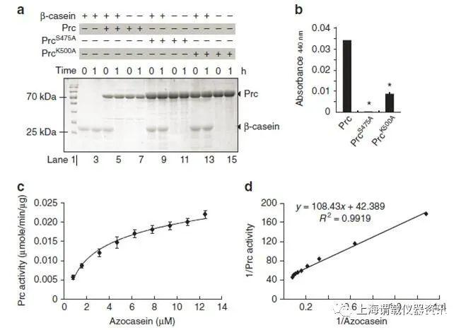 圖2、Prc是一種絲氨酸內(nèi)肽酶。Prc可降解β-酪蛋白,其內(nèi)肽酶活性依賴于Ser475和Lys500。圖b表示的是通過降解底物的偶氮雜蛋白酶定量研究Prc內(nèi)肽酶活性。圖c和圖d表示的是偶氮酪蛋白水解酶活性的邁克爾-門登動力學(xué)擬合曲線。