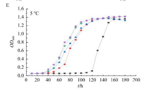 取OD600為0.1的菌懸液1 mL,轉(zhuǎn)接于50 mL的LB液體培養(yǎng)基中,在5、10、15、20、30℃條件下振蕩培養(yǎng)(180 r/min),測定不同培養(yǎng)時間下菌液的OD600值,并分別以培養(yǎng)時間和OD600值為橫坐標和縱坐標繪制菌株生長曲線。