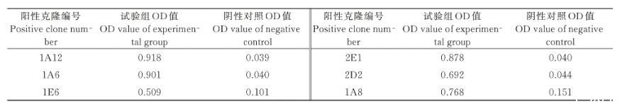 通過對(duì)陽性克隆的序列進(jìn)行比對(duì),篩選出6個(gè)VHH序列。經(jīng)過ELISA法對(duì)6個(gè)陽性克隆進(jìn)行抗原結(jié)合力檢測(cè),選取1A12作為候選克?。ū?)。1A12的核苷酸序列與NCBI數(shù)據(jù)庫(kù)中的VHH序列相似性達(dá)到78%,通過對(duì)1A12克隆的氨基酸序列分析,發(fā)現(xiàn)該序列沒有形成跨膜區(qū),為親水性蛋白。1A12的氨基酸序列由88個(gè)氨基酸構(gòu)成,含有完整的4個(gè)框架區(qū)(FR1~FR4)和3個(gè)高度可變抗原結(jié)合區(qū)即互補(bǔ)決定區(qū)(CDR1~CDR3),其中CDR3是抗原特異性識(shí)別的區(qū)域,含有11個(gè)氨基酸。