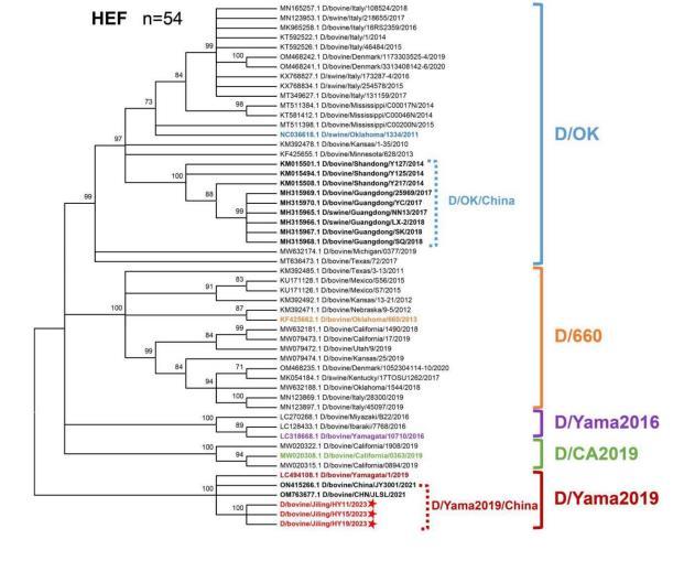使用MEGAXI對HEF基因片段的核苷酸序列進行了排列和分析,并進行了1000次引導重復。主要節(jié)點左側的Bootstrap分數(shù)至少為70。IDV五個現(xiàn)存譜系(D/OK-、D/660-、D/Yama2016-、D/CA2019-和D/Yama2019--品系)的每個分支分別用藍色、橙色、紫色、綠色和紅色標出。本研究中描述的菌株(D/bovine/Jilin/HY11/2023,D/bovine/Jilin/HY15/2023and D/bovine/Jilin/HY19/2023)用星號標記。在中國發(fā)現(xiàn)的菌株加粗標出,結果如圖2所示。