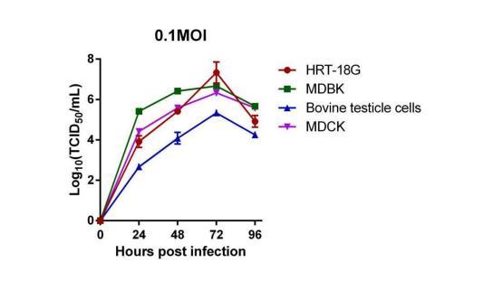 研究了HY11毒株在HRT-18G(購自于美國模式培養(yǎng)物集存庫,ATCC NO.CRL-11663)、MDCK(購自于武漢普諾賽生命科技有限公司,貨號CL-0153)、MDBK(購自于武漢普諾賽生命科技有限公司,貨號CL-0154)以及原代牛睪丸細胞(購自于北京博易匯科生物技術有限公司)的復制動力學,通過TCID50滴定了病毒在MDCK細胞中的病毒滴度。以0.1倍感染率(MOI)接種HRT-18G、MDCK、MDBK以及Bovine testicle cell細胞HY11株,在不同時間點(24、48、72和96小時)收集細胞培養(yǎng)上清。結果表明,分離出的HY11在這幾種細胞中復制活躍,趨勢相似,72小時后達到最高滴度。圖1所示為間隔24小時的生長曲線。