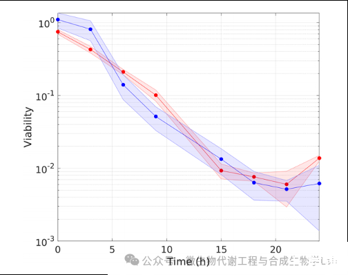 DC菌株的遺傳穩(wěn)定性是通過(guò)進(jìn)一步修改細(xì)菌的必要轉(zhuǎn)錄機(jī)制獲得的。這些額外的修飾可能會(huì)影響細(xì)胞的活力,即一旦誘導(dǎo)劑在一段時(shí)間的生長(zhǎng)停滯后被重新供應(yīng),它們就具能重新開(kāi)始生長(zhǎng)。在生長(zhǎng)階段和生產(chǎn)階段之間進(jìn)行迭代的可能性在生物技術(shù)過(guò)程中是很重要的。因此,研究人員對(duì)SC和DC菌株進(jìn)行了活性試驗(yàn),并比較了結(jié)果。