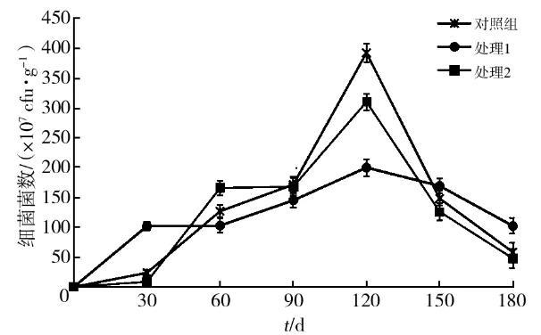 對(duì)照組和處理2可培養(yǎng)細(xì)菌數(shù)在0~120 d時(shí)一直呈上升趨勢(shì),第120天時(shí)達(dá)到峰值,分別為3.92×109cfu/g和3.10×109cfu/g,可培養(yǎng)細(xì)菌數(shù)明顯高于處理1,之后迅速下降,在第180天時(shí),可培養(yǎng)細(xì)菌數(shù)已分別下降至0.58×109cfu/g和0.48×109cfu/g,可培養(yǎng)細(xì)菌數(shù)均低于處理1。