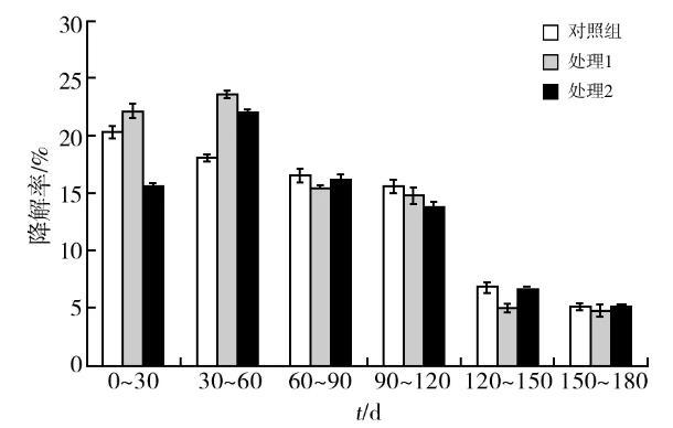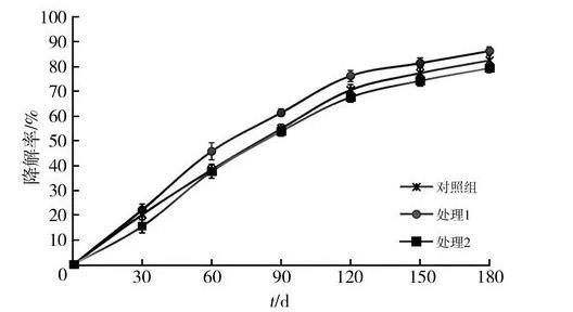 從圖2可以看出,處理1與對(duì)照組相比,在0~30 d和30~60 d時(shí)段,處理1的秸稈降解率明顯高于對(duì)照組,從第60天開(kāi)始,處理1的降解率始終低于對(duì)照組,但是總降解率始終是處理1高于對(duì)照組;處理2與對(duì)照組相比,在0~30 d,處理2的降解率明顯低于對(duì)照組,但30~60 d出現(xiàn)一個(gè)降解高峰,之后處理2的降解率始終低于對(duì)照組,但總降解率對(duì)照組高于處理2;處理1與處理2相比,在0~30 d和30~60 d時(shí)段,處理1的秸稈降解率明顯高于處理2,之后的降解率沒(méi)有明顯規(guī)律,相互有高有低,但總降解率始終是處理1高于處理2。