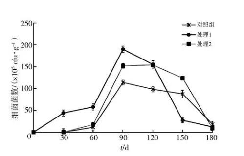 從圖3可以看出,處理1在0~30 d時(shí)可培養(yǎng)細(xì)菌數(shù)增加迅速,第120天時(shí)達(dá)到峰值為2.00×109cfu/g,之后緩慢下降;從處理1的整個(gè)試驗(yàn)時(shí)段來(lái)看,可培養(yǎng)細(xì)菌數(shù)增加和下降速度較緩慢,在第180天時(shí),可培養(yǎng)細(xì)菌數(shù)仍為1.02×109cfu/g。