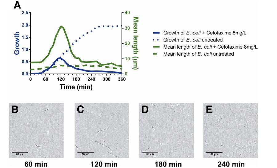 圖2、哌拉西林對(duì)oCelloScope系統(tǒng)獲得的大腸桿菌生長(zhǎng)和長(zhǎng)度的影響。a)采用兩種不同的算法對(duì)未經(jīng)處理(點(diǎn)線)和頭孢噻肟處理(實(shí)線)的大腸桿菌進(jìn)行細(xì)菌生長(zhǎng)動(dòng)力學(xué)和成絲的定量測(cè)定:生長(zhǎng)動(dòng)力學(xué)(藍(lán)色圖)是基于分割和提取表面積測(cè)量的,細(xì)菌長(zhǎng)度(綠色圖)是基于分割提取的平均長(zhǎng)度測(cè)量的。8 mg/L頭孢噻肟處理后,oCelloScope系統(tǒng)分別在(b)60 min、(c)120 min、(d)180 min和(e)240 min時(shí)獲得大腸桿菌的形態(tài)學(xué)圖像。