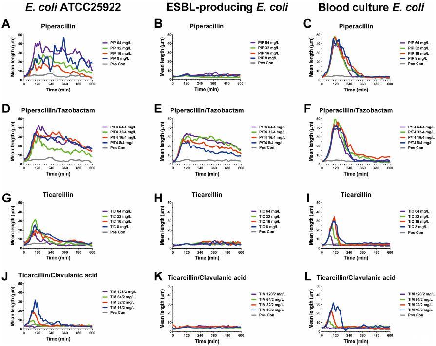圖5、β-內(nèi)酰胺-β-內(nèi)酰胺酶抑制劑組合對(duì)大腸桿菌細(xì)菌長(zhǎng)度的影響。對(duì)照菌株大腸桿菌、產(chǎn)esbl大腸桿菌和血培養(yǎng)大腸桿菌分別用4種不同濃度的哌拉西林單獨(dú)(a-c)或補(bǔ)充他唑巴坦(d-f)和噻卡西林單獨(dú)(g-i)或補(bǔ)充克拉維酸(j-1)處理。每15 min重復(fù)測(cè)量細(xì)菌長(zhǎng)度,持續(xù)10 h。