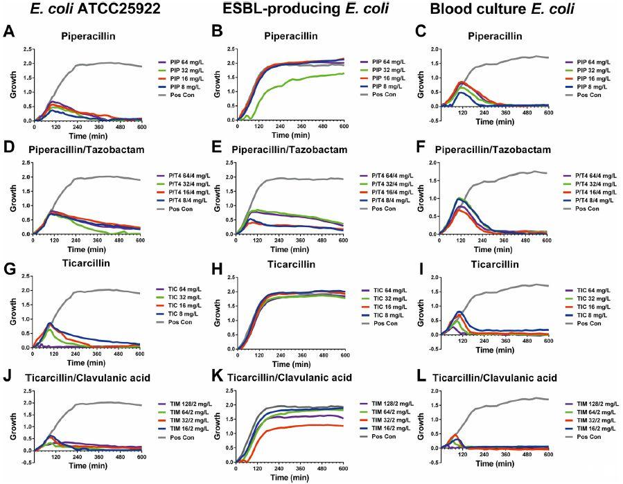 圖4、β-內(nèi)酰胺-β-內(nèi)酰胺酶抑制劑組合對(duì)大腸桿菌生長(zhǎng)動(dòng)力學(xué)的影響。對(duì)照菌株大腸桿菌、產(chǎn)esbl大腸桿菌和血培養(yǎng)大腸桿菌分別用4種不同濃度的哌拉西林單獨(dú)(a-c)或補(bǔ)充他唑巴坦(d-f)和噻卡西林單獨(dú)(g-i)或補(bǔ)充克拉維酸(j-1)處理。每隔15 min重復(fù)測(cè)定生長(zhǎng)動(dòng)力學(xué),持續(xù)10 h。