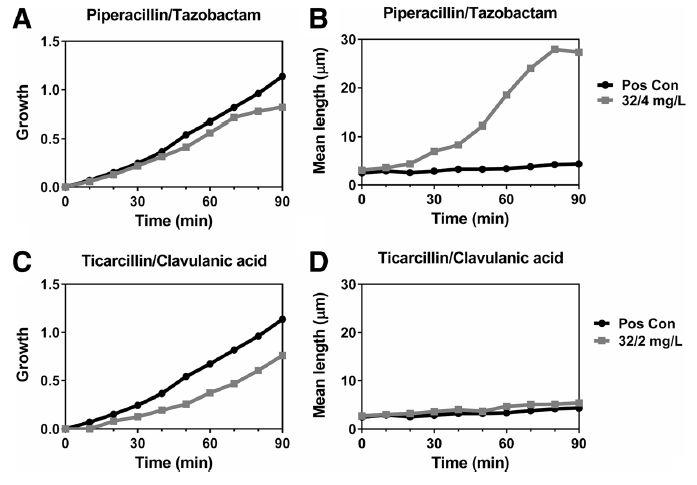 圖3、β-內(nèi)酰胺-β-內(nèi)酰胺酶抑制劑聯(lián)合應(yīng)用于抗生素誘導(dǎo)產(chǎn)esbl大腸桿菌成絲的早期檢測(cè)。哌拉西林/他唑巴坦(32/4 mg/L)(a-b)或替卡西林/克拉維酸(32/2 mg/L)(c-d)處理大腸桿菌的生長(zhǎng)動(dòng)力學(xué)和平均細(xì)菌長(zhǎng)度。哌拉西林/他唑巴坦誘導(dǎo)的微絲(長(zhǎng)度增加>5μm)可在30 min內(nèi)檢測(cè)到,而替卡西林/克拉維酸誘導(dǎo)的微絲缺失可在40 min內(nèi)檢測(cè)到。