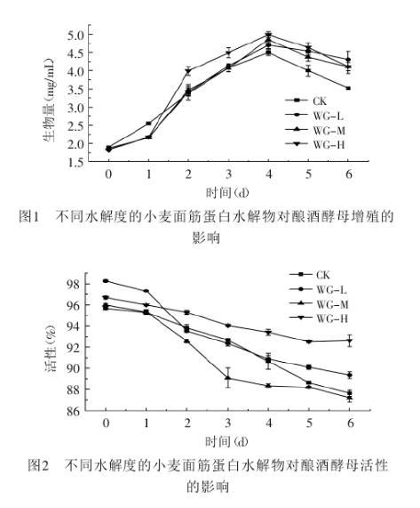 不同水解度的小麥面筋蛋白水解物中肽的分子量分布如圖。可以看出,水解度越高,分子量在3ku以下的肽含量越多,表明小麥面筋蛋白水解物中對酵母增殖起作用的肽主要集中在小分子量段。小麥面筋蛋白水解物的促增殖機(jī)理可能是由于WG-H具有更多小分子肽,這些小分子肽在發(fā)酵過程中更容易被酵母細(xì)胞利用,起到補(bǔ)充氮源的作用。
