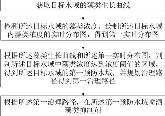 S600:根據(jù)所述藻類生長曲線和所述第二實時分布圖,判別所述目標(biāo)水域中藻類濃度達(dá)到濃度閾值的區(qū)域,得到所述目標(biāo)水域的第二預(yù)防水域,并規(guī)劃治理路徑得到第二治理路徑;S700:根據(jù)所述第二治理路徑,在所述第二預(yù)防水域噴灑藻類抑制劑。