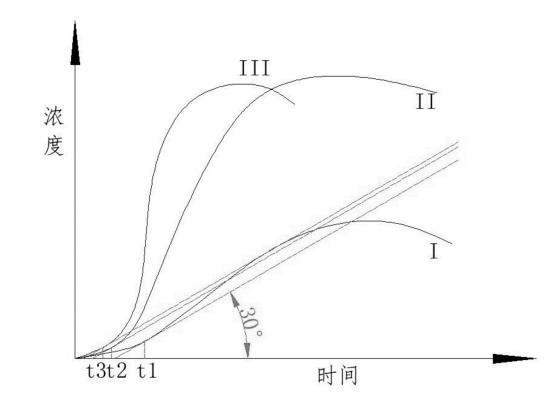 本實施例中,濃度閾值對應(yīng)對數(shù)生長期前的藻類濃度臨界點。對數(shù)生長期前具體指藻類由延滯期開始增長至進(jìn)入對數(shù)增長陡增區(qū)域之間的時間。在一種具體的實施方式中,藻類濃度達(dá)到5×104cell/L,或藻類生長曲線斜率達(dá)到30°時,實時的藻類濃度視為達(dá)到濃度閾值。優(yōu)選地,濃度閾值根據(jù)藻類生長曲線的斜率確定,生長曲線前期與對數(shù)增長陡增區(qū)域之間臨界點所在斜率作為濃度閾值的確定標(biāo)準(zhǔn),即生長曲線前期與對數(shù)增長陡增區(qū)域之間臨界點所在的藻類濃度值視為濃度閾值。如圖2,藻類生長曲線斜率達(dá)到30°時,時間點t1、t2、t3對應(yīng)的藻類濃度值視為Ⅰ、Ⅱ、Ⅲ三條藻類生長曲線對應(yīng)的濃度閾值。