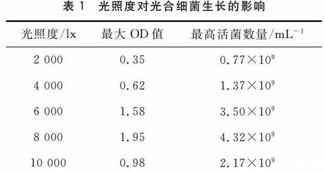 從表1可見,光合細(xì)菌在光照強(qiáng)度2 000~10 000 lx的范圍內(nèi)均可以生長,而且在2 000~8 000 lx范圍內(nèi),光強(qiáng)度越大,光合細(xì)菌的生長速度就越快,生物量也越大,而且菌液粘稠均勻,無分層、無附壁。但在10 000 lx強(qiáng)光照度下,光合細(xì)菌的生長明顯受到了抑制,菌液顏色發(fā)生變化且分層、附壁現(xiàn)象較嚴(yán)重。因此,光合細(xì)菌比較適宜在光強(qiáng)度為6 000~8 000 lx下培養(yǎng)。在實際批量生產(chǎn)過程中可采用增減遮陰網(wǎng)疏密來調(diào)節(jié)光照度實現(xiàn)室外自然光照培養(yǎng)。
