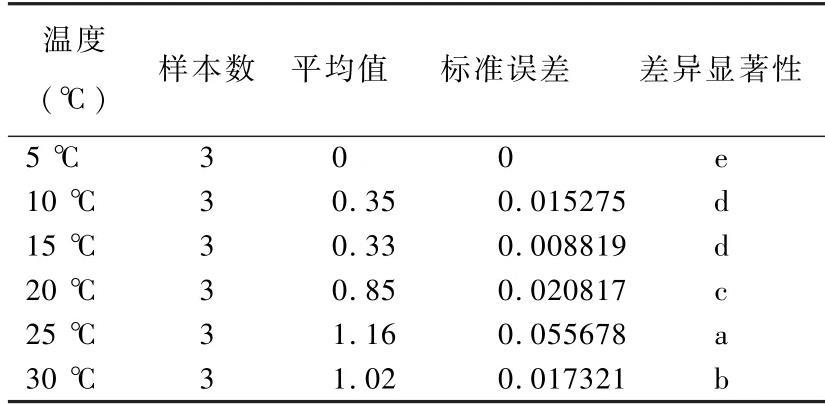 表1菌核在不同溫度下產(chǎn)生菌絲的狀況