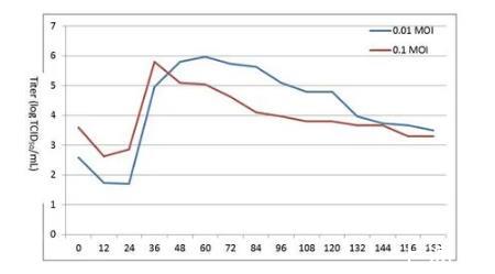 不同病毒接種量TCID50檢測(cè)結(jié)果顯示,0.1 MOI接種量在接種后36h即可達(dá)到病毒滴度峰值,0.01 MOI接種量則在60h病毒滴度峰值。就出現(xiàn)后的下降速度而言,0.1 MOI接種量出現(xiàn)峰值后滴度迅速下降,84h后病毒滴度降低至104TCID50/mL以下,而0.01 MOI接種量出現(xiàn)峰值雖然較晚,但直至接毒132 h后病毒滴度才下降至104TCID50/mL以下;兩者在接毒168h后,病毒滴度基本相同,為103.5TCID50/mL左右(圖5)。