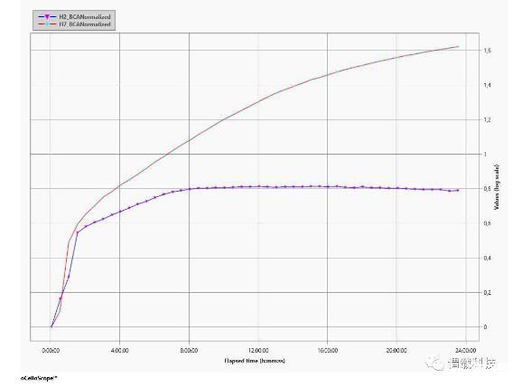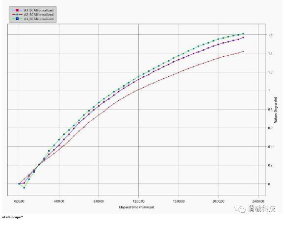 圖2、采用Biosense微生物動態(tài)監(jiān)測系統(tǒng)中的BCA歸一化算法測量膿腫分枝桿菌生長曲線(三份)