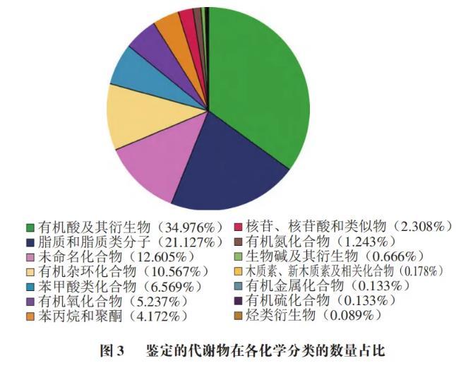 兩組樣本中檢測到的代謝物包括有機酸及其衍生物(34.976%),脂質(zhì)和脂質(zhì)類分子(21.127%),有機雜環(huán)化合物(10.567%),苯甲酸類(6.569%),有機氧化合物(5.237%),苯丙烷和聚酮(4.172%),核苷、核苷酸和類似物(2.308%),有機氮化合物(1.243%),生物堿及其衍生物(0.666%),木質(zhì)素、新木質(zhì)素及相關(guān)化合物(0.178%),有機金屬化合物(0.133%),有機硫化合物(0.133%),烴類衍生物(0.089%)和未命名化合物(12.605%)等。