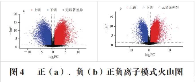 在進(jìn)行兩組樣本間的差異分析時(shí),常用的單變量統(tǒng)計(jì)分析方法包括差異倍數(shù)(FC)分析、T檢驗(yàn)/非參檢驗(yàn)?;趩巫兞糠治觯瑢?duì)正、負(fù)離子模式下檢測(cè)到的所有代謝物(含未被鑒定的代謝物)進(jìn)行差異分析,篩選出FC>1.5或FC<0.67,P<0.05的差異代謝物共902種,其中正離子模式下670種,負(fù)離子模式下232種。將這些差異代謝物用火山圖的形式表示,結(jié)果如圖4所示。