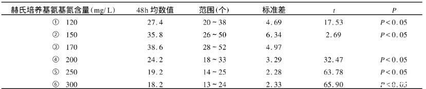 表2赫氏培養(yǎng)基不同氨基氮含量對強毒菌141生長影響的觀察