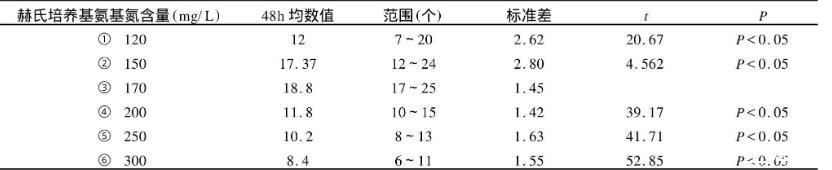 目的探討不同氨基氮含量對鼠疫菌生長的影響觀察。方法同批次消化液不同含量(120mg/L、150mg/L、170mg/L、200mg/L、250mg/L、300mg/L)氨基氮作為基礎消化液制備的赫氏瓊脂培養(yǎng)基(指100mL培養(yǎng)基內(nèi)所含的氨基氮)進行活菌數(shù)實驗,尋找出適宜鼠疫菌生長的最佳氨基氮。結果通過反復實驗發(fā)現(xiàn)6種不同氨基氮含量對鼠疫菌生長影響中170mg/L含量的赫氏培養(yǎng)基優(yōu)于其它5種氨基氮含量培養(yǎng)基,經(jīng)統(tǒng)計學分析有差異(P<0.05)。結論鼠疫菌生長的最佳氨基氮含量為170mg/L。