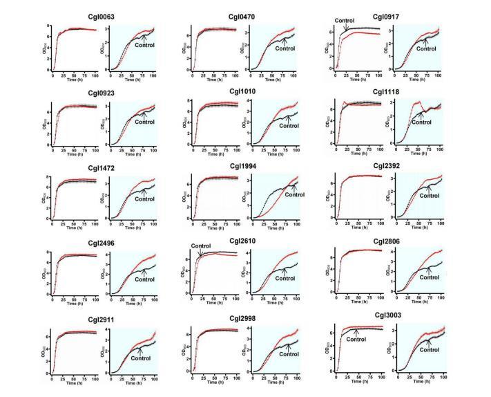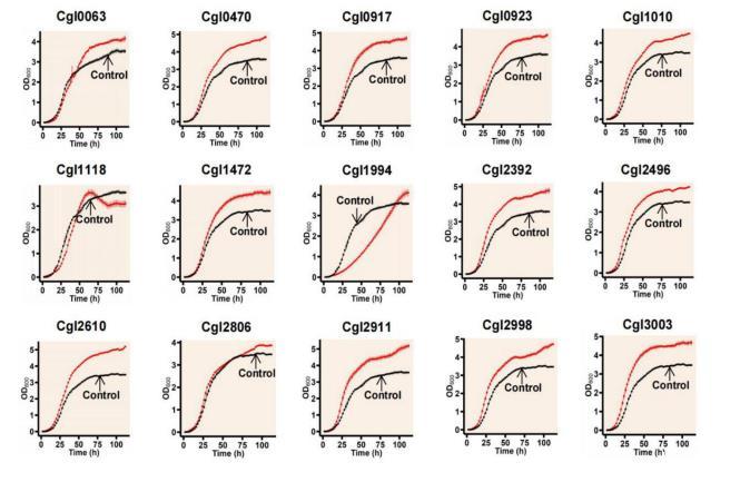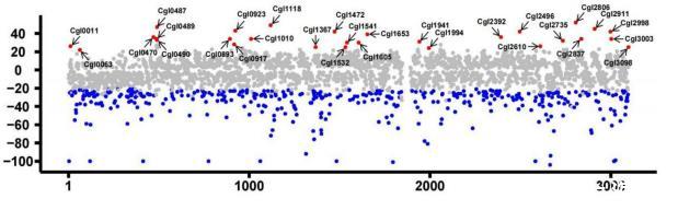 結(jié)果如圖1所示,所有基因均顯示了30h至終點生長過程連續(xù)15個最大值的平均值,其中最上面的深色點是15個值均提高20%以上的基因,下面的深色點代表15個值均降低20%以上的基因。生長提高的基因一共29個,包括以下基因cgl0011、cgl0063、cgl0470、cgl0487、cgl0489、cgl0490、cgl0893、cgl0917、cgl0923、cgl1010、cgl1118、cgl1367、cgl1472、cgl1532、cgl1541、cgl1605、cgl1653、cgl1941、cgl1994、cgl2392、cgl2496、cgl2610、cgl2735、cgl2806、cgl2937、cgl2911、cgl2998、cgl3003、cgl3098。