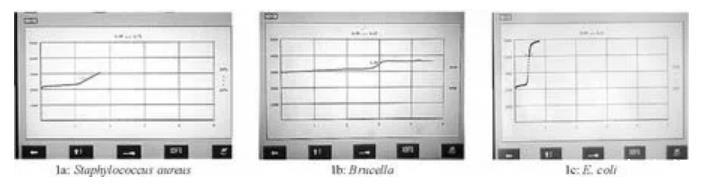 絕大多數(shù)細菌是以二分裂方式繁殖,所以可以將生長和繁殖的整個過程分為遲緩期、對數(shù)生長期和穩(wěn)定期。繁殖速度快的菌種一般遲緩期較短,繁殖速度慢的菌種一般遲緩期較長。圖1a為本實驗室培養(yǎng)出金葡菌生長曲線,葡萄球菌屬細菌生長期曲線有一定的傾斜可見遲緩期、對數(shù)生長期及穩(wěn)定期3個階段,生長期曲線角度較大;圖1b是本實驗室培養(yǎng)出布魯菌生長曲線,布魯菌遲緩期曲線較平坦,3 d左右陽性報警,生長期曲線短,穩(wěn)定期曲線平坦;圖1c是本實驗室培養(yǎng)出大腸埃希菌生長曲線,腸桿菌科細菌遲緩期較短,生長期生長迅速,甚至無穩(wěn)定期。