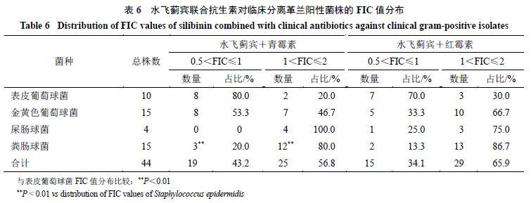 FIC值結(jié)果見表5。水飛薊賓與青霉素聯(lián)合,對表皮葡萄球菌和金黃色葡萄球菌有相加作用,對屎腸球菌和糞腸球菌是無關(guān)作用。水飛薊賓與紅霉素聯(lián)合,對表皮葡萄球菌和金黃色葡萄球菌分別為協(xié)同和相加作用,對屎腸球菌和糞腸球菌是無關(guān)作用。水飛薊賓與環(huán)丙沙星聯(lián)合,對大腸埃希菌和銅綠假單胞菌均為拮抗作用。水飛薊賓與慶大霉素聯(lián)合,對大腸埃希菌和銅綠假單胞菌均為無關(guān)作用。