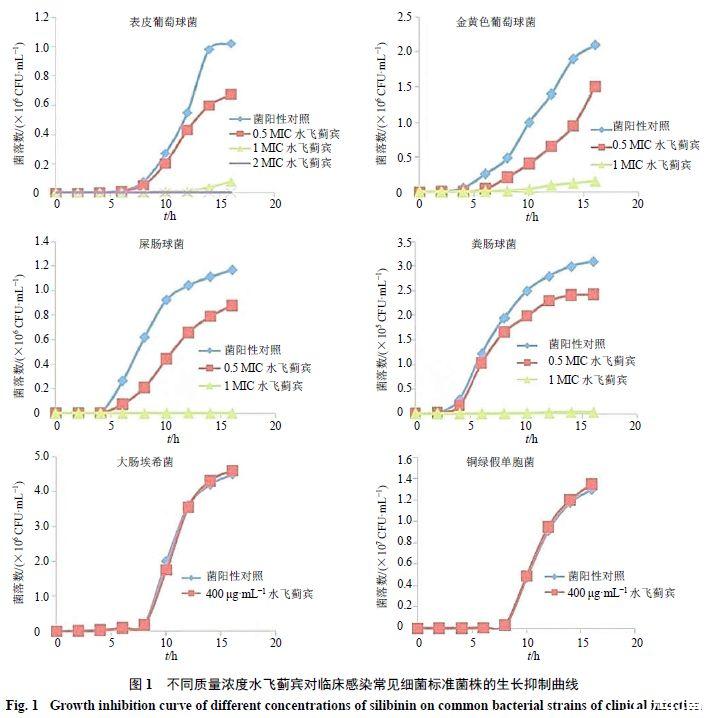 不同質(zhì)量濃度水飛薊賓對6種標準菌株的生長抑制曲線(一)