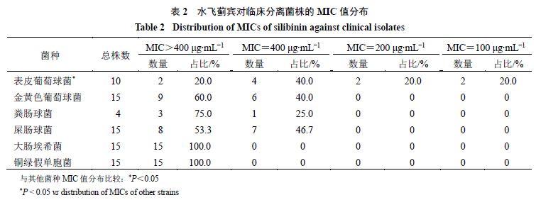 結(jié)果見表2。水飛薊賓對表皮葡萄球菌臨床分離菌株的MIC值分布為>400、400、200、100μg/mL,對應菌株占比分別為20.0%、40.0%、20.0%、20.0%;對金黃色葡萄球菌、糞腸球菌和屎腸球菌臨床分離菌株的MIC值分布為>400、400μg/mL;對大腸埃希菌和銅綠假單胞菌臨床分離菌株的MIC值均>400μg/mL。表皮葡萄球菌的MIC值分布與其他測試菌種比較,差異顯著(P<0.05)。