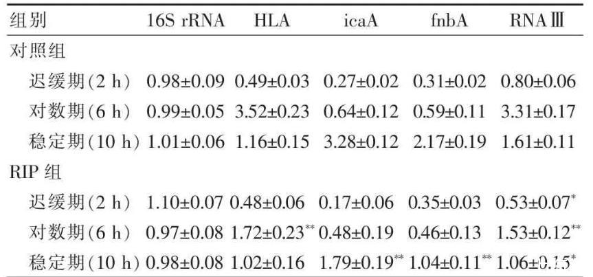 遲緩期(2 h),與對(duì)照組比較,RIP 組RNAⅢ表達(dá)明顯降低(P <0.05)。對(duì)數(shù)期(6 h),與對(duì)照組比較,RIP 組RNAⅢ、HLA 表達(dá)顯著降低(P <0.01);穩(wěn)定期(10 h),與對(duì)照組比較,RIP 組icaA、fnbA 和RNAⅢ表達(dá)顯著降低(P <0.05 或P <0.01)。見(jiàn)表2。