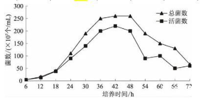 生長(zhǎng)曲線的繪制以膠紅酵母J6發(fā)酵液的培養(yǎng)時(shí)間為橫坐標(biāo)、發(fā)酵液中細(xì)菌的數(shù)量為縱坐標(biāo),繪制生長(zhǎng)曲線。