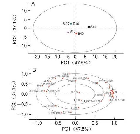 為了進(jìn)一步了解紅曲霉強(qiáng)化發(fā)酵對黃豆醬揮發(fā)性風(fēng)味物質(zhì)的影響,對39種主要呈香風(fēng)味化合物進(jìn)行PCA,如圖1A所示。PC1和PC2累計貢獻(xiàn)率達(dá)到84.6%,可代表大部分風(fēng)味物質(zhì)的信息。