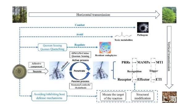 該論文還概括內(nèi)生真菌的定殖過程——內(nèi)生真菌通過特定的附著和穿透機制在植物體內(nèi)定殖。該論文指出當前較為完整的內(nèi)生真菌從進入宿主到在體內(nèi)成功定殖的兩種進化策略為:(1)避免和/或抑制宿主防御機制,并免受宿主產(chǎn)生的其他有毒代謝物的侵害;(2)通過群體感應和群體淬滅調(diào)節(jié)常駐內(nèi)生菌的生長和毒性。