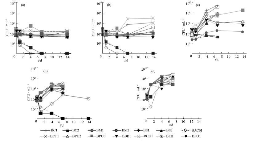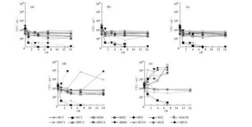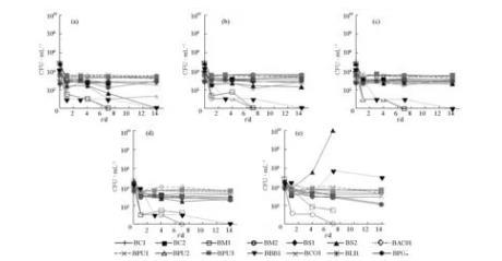 所有的菌株都在腦心浸出液肉湯(BHI Broth,Difco)中于30℃、有氧條件下復(fù)活復(fù)壯。實(shí)驗(yàn)前均須經(jīng)過(guò)24 h的培養(yǎng),然后在離心機(jī)(Sorvall®Biofuge Fresco)1000×g轉(zhuǎn)速(4℃,2 min)下用0.85%的鹽水清洗2次。分別在培養(yǎng)0 d、第1 d、第3 d、第7 d和第14 d取樣,使用Tryptic Soy Agar(TSA,Becton Dickinson)平板記錄芽孢桿菌的活菌數(shù)(CFU·mL-1)。