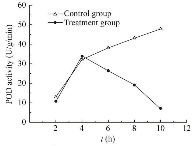 2.3.2納米銀處理時間對過氧化物酶(POD)活性的影響:POD對照組活性與SOD對照組表現(xiàn)出相似的變化情況,隨著處理時間的增加不斷升高。處理組的POD活性隨著時間的延長同樣呈現(xiàn)先升高后下降的趨勢,在4 h達(dá)到最大值,為對照組的1.05倍,與SOD活性最高值出現(xiàn)在4 h相同,在10 h達(dá)到最小值,為對照組的14.85%(圖3)。2、4、6、8、10 h各處理組POD活性相比差異顯著。