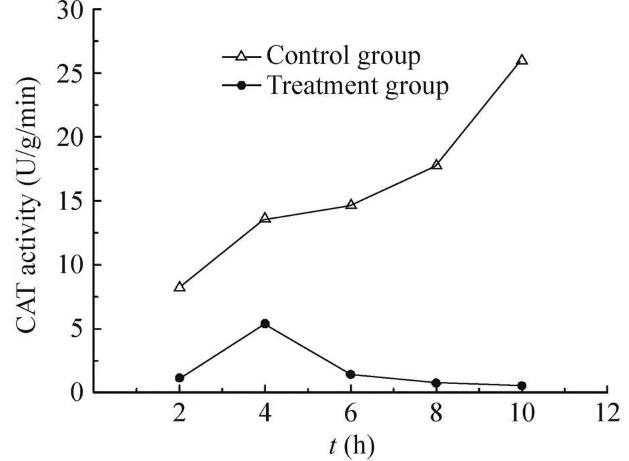 2.3.3納米銀處理時間對過氧化氫酶(CAT)活性的影響:對照組CAT酶活在試驗(yàn)時間內(nèi),呈上升趨勢,納米銀對小麥赤霉病菌的CAT酶活性出現(xiàn)先升高后下降的變化,與SOD、POD活性呈現(xiàn)出相似的變化趨勢,4 h的CAT酶活出現(xiàn)最大值,處理組的CAT活性一直低于對照組(圖4)。與其他處理時間的活性相比差異顯著。