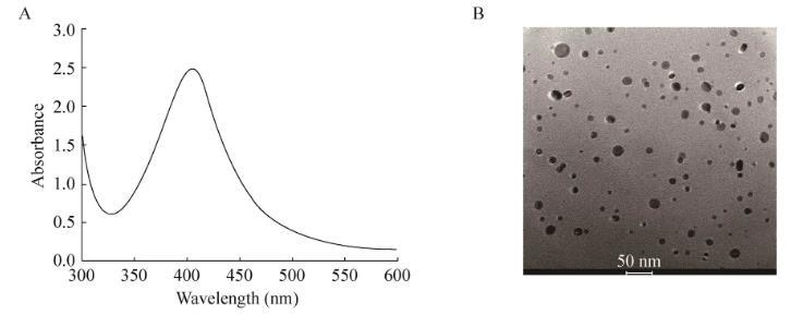 圖1納米銀粒子的UV-vis吸收光譜圖(A)及TEM圖(B)