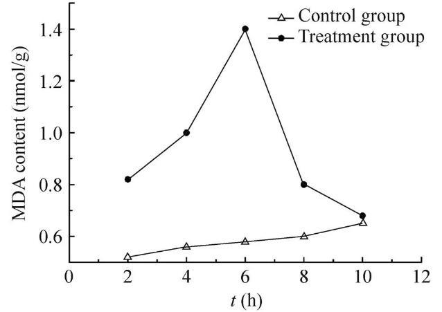 處理組MDA含量呈現(xiàn)先升高后降低的趨勢,在6 h時,迅速上升至最高值1.40 nmol/g,為對照組的2.41倍,6 h后開始出現(xiàn)下降趨勢,10 h降至最低,為對照組的1.05倍。對照組在2?10 h,呈現(xiàn)平緩的上升趨勢,10 h出現(xiàn)最大值,但始終低于處理組(圖5)。